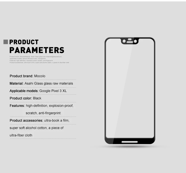 В комплект входить: захисне скло Mocolo, спиртова серветка для очищення дисплея смартфона, тканина з мікрофібри, стікери для коректної установки захисного скла.